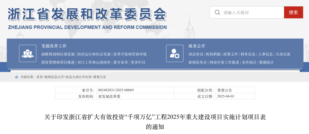 近日,据中国水网获悉,浙江省发展和改革委员会发布了《关于印发浙江省扩大有效投资“千项万亿”工程2025年重大建设项目实施计划项目表的通知》。